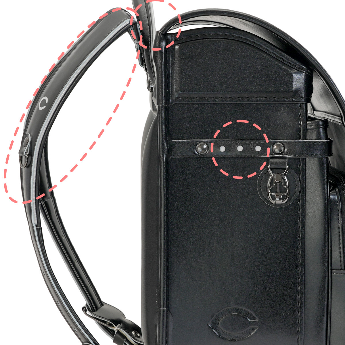 ランドセルの持ち手に反射素材を挟み込んで縫製している業界初の技術です。